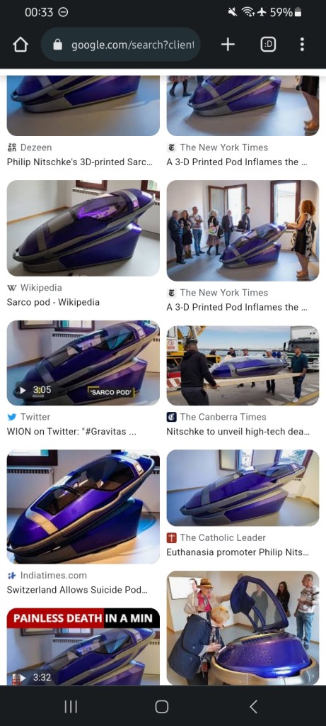 I need deathpod to arrive in 20 years… here in Los Angeles California. There’s nothing to be alive about after age 60 Posted bycxaxrxl@protonmail.chMay 21, 2023May 21, 2023Posted inUncategorized Share this: Click to share on X (Opens in new window) X Click to share on Facebook (Opens in new window) Facebook Like Loading...